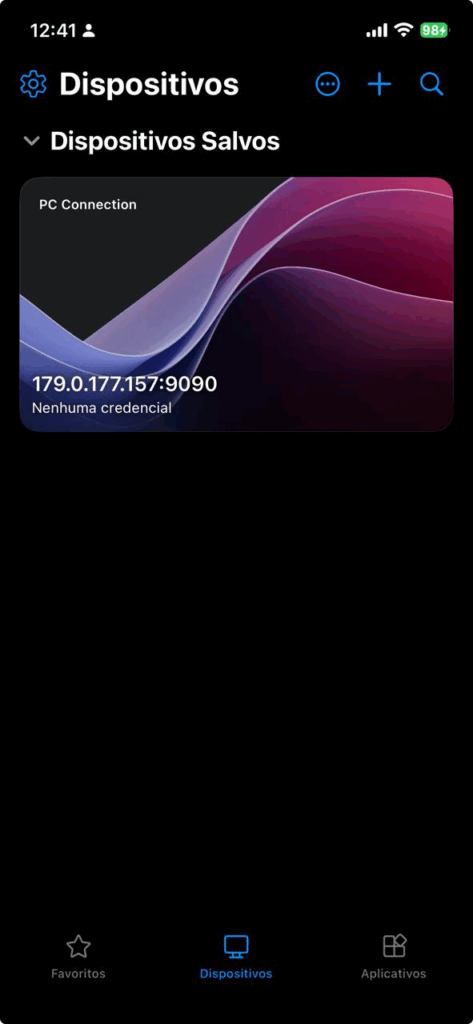 5. Após adicionar o IP, sua máquina aparecerá na seção “Dispositivos Salvos”. Selecione-a para iniciar a conexão e informe as credenciais de acesso.