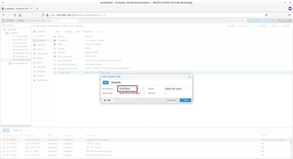 Escolha o tipo de barramento como “VirtIO Block” para obter o melhor desempenho de E/S de disco e aperte o botão “Adicionar”.