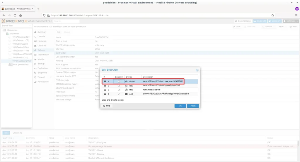 Para inicializar a partir do novo disco, ele deve estar no topo na janela de ordem de inicialização. Selecione o disco Virtio recém-adicionado e arraste-o para o topo. Certifique-se de que você marcou a caixa de seleção para ativar o disco. Clique em “OK” para salvar.
