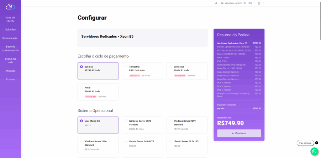Passo 7: Por fim, clique em “Finalizar” para concluir o pedido. A fatura será gerada de acordo com a forma de pagamento escolhida. Depois é só efetuar o pagamento (por boleto, PIX, etc.) e, após a confirmação, seu servidor dedicado será preparado e você receberá os dados de acesso.