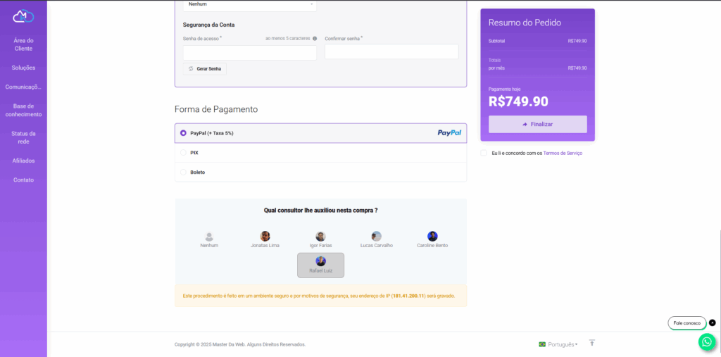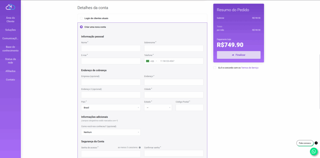 Passo 4: Em seguida, você chegará a uma página de resumo do pedido, onde poderá conferir se o plano, as configurações e o valor estão corretos. Se ainda não tiver uma conta na Master da Web, basta preencher seus dados para criar o cadastro.