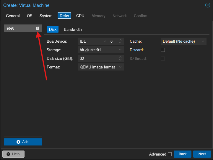 .qcow2 que será importado.Agora entre na maquina virtual que você criou anteriormente e selecione a guia “Hardware”. No lado direito, você vai o disco QCOW2 recém-importado como disco não utilizado. Selecione o disco não utilizado e, em seguida, clique no botão “Editar”.