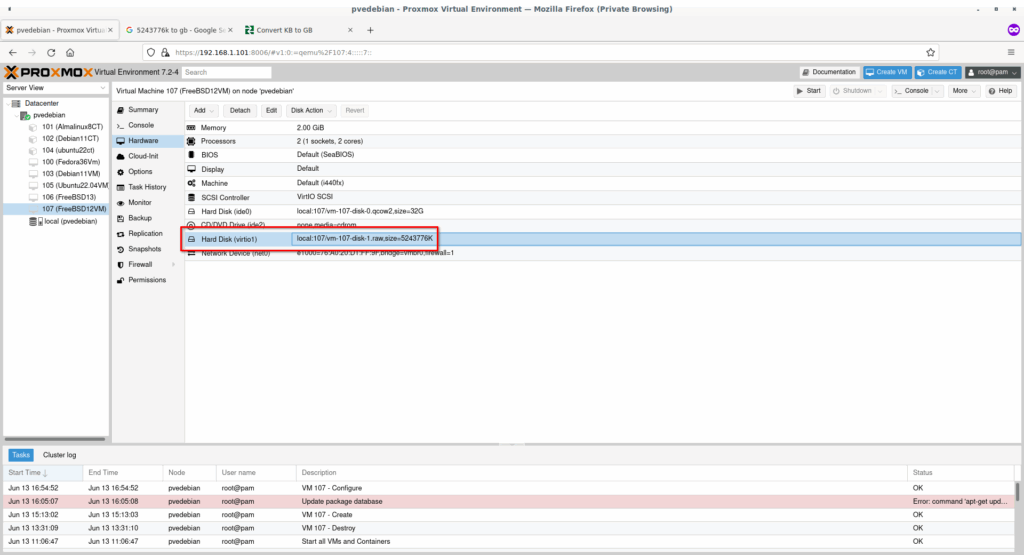 Agora você verá um novo disco com VirtIO como tipo de barramento conectado à VM.