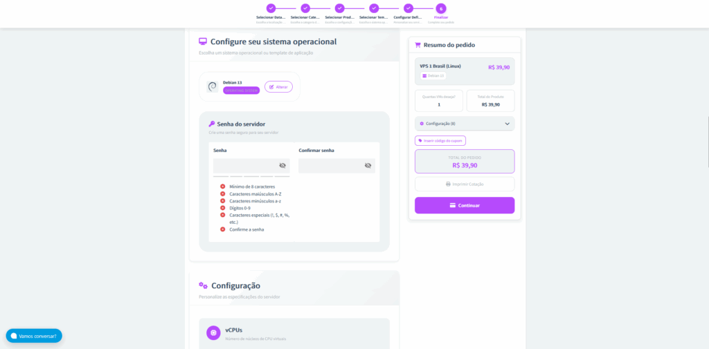 Passo 6: Crie uma senha de acesso para sua VPS. Logo depois, você poderá personalizar as especificações do servidor, ajustando recursos como vCPUs, memória RAM, armazenamento e outras configurações conforme sua necessidade.