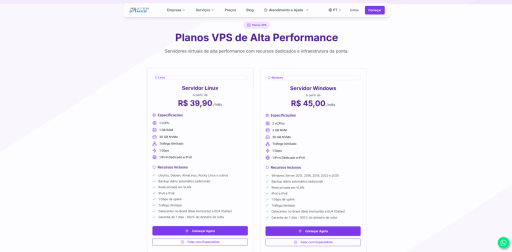 Passo 1: Acesse o site oficial da Master da Web em masterdaweb.com. Ao entrar na página inicial, role para baixo até encontrar o card “VPS (Virtual Private Server)”. Quando localizar, clique em “Saiba Mais” para ser direcionado à página específica de servidores VPS.