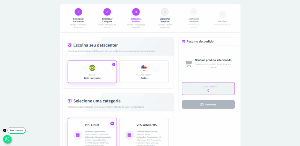 Passo 3: Na página de contratação, escolha o datacenter desejado. Em seguida, selecione a categoria “VPS Windows”.