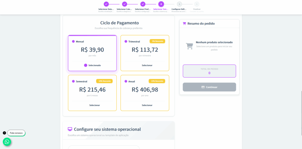 Passo 4: Agora, escolha o tipo de VPS que melhor atenda às suas necessidades conforme citado anteriormente. Depois, selecione o ciclo de pagamento (mensal, trimestral, semestral ou anual).
