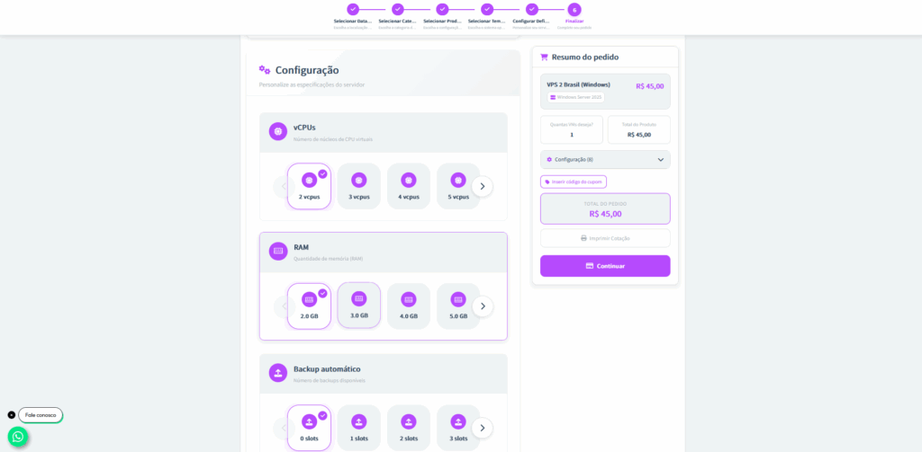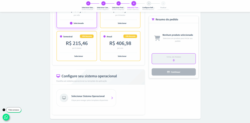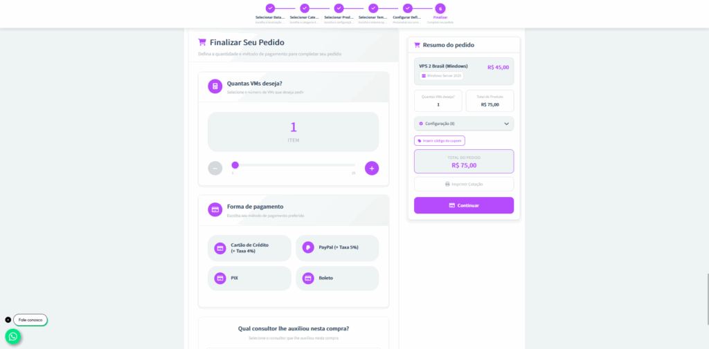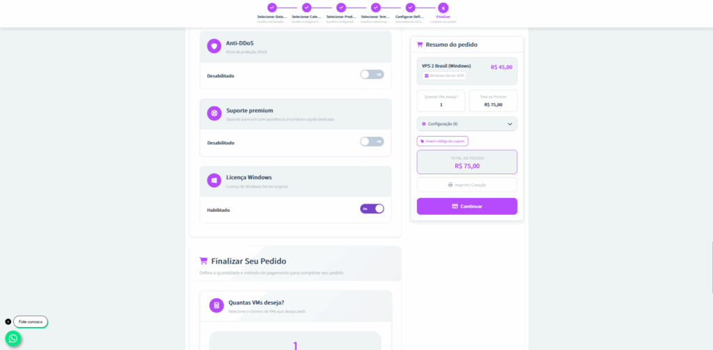 Passo 8: Após a personalização, escolha quantas VMs (Virtual Machines) deseja contratar e defina a forma de pagamento.