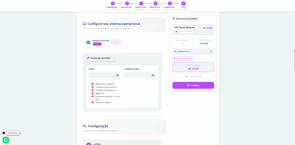 Passo 6: Crie uma senha de acesso para sua VPS. Logo depois, você poderá personalizar as especificações do servidor, ajustando recursos como vCPUs, memória RAM, armazenamento e outras configurações conforme sua necessidade.
