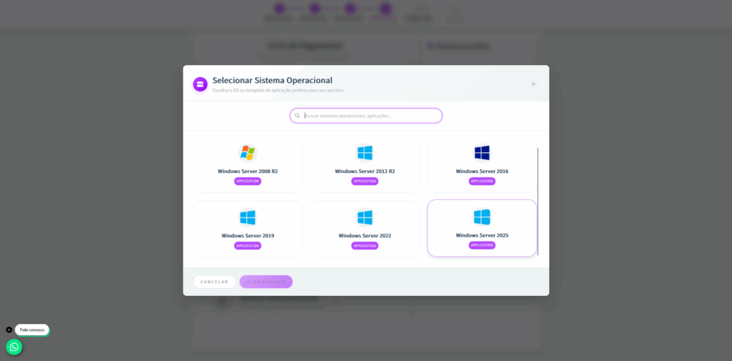 Passo 5: Em seguida, defina o Sistema Operacional da sua VPS. Nesse caso, escolha a versão do Windows Server que mais te atenda e depois clique em Selecionar.