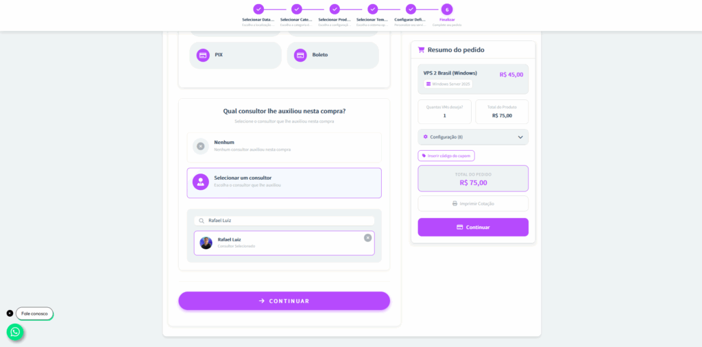 Passo 9: Se durante o processo de contratação você foi atendido por algum consultor da Master da Web, este é o momento de selecioná-lo. Assim, o consultor responsável receberá o devido reconhecimento pelo atendimento prestado.