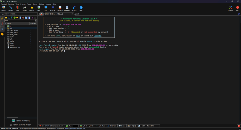 A sessão será aberta automaticamente, permitindo acesso completo ao servidor.