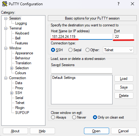 2. Abra o programa PuTTY e no campo Host Name (ou IP address), informe o IP do seu servidor.