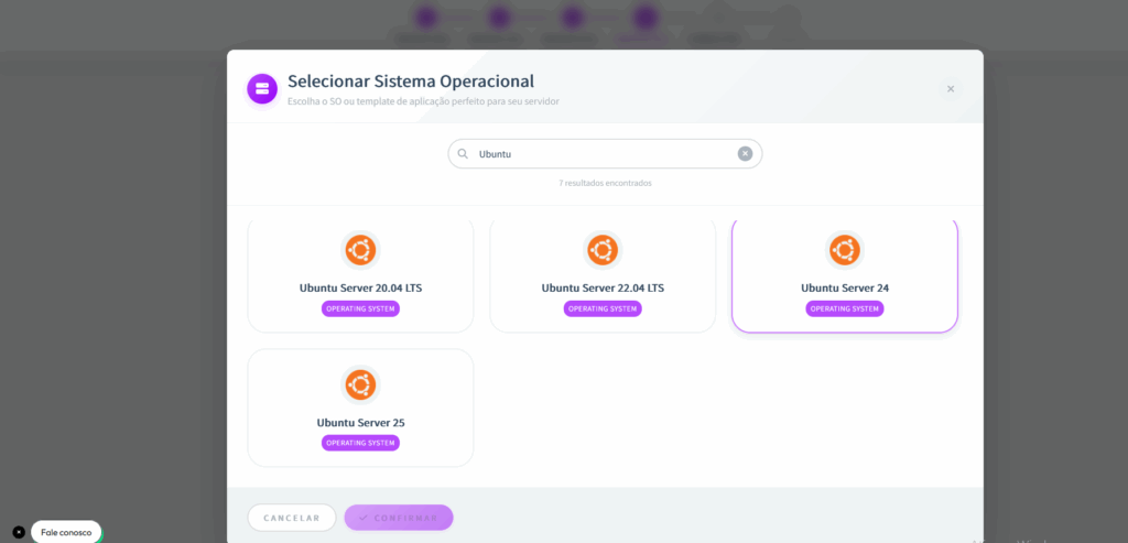 No nosso caso, selecione Ubuntu 25.04 clicando em “Selecionar Sistema Operacional” e escolhendo essa versão na lista.