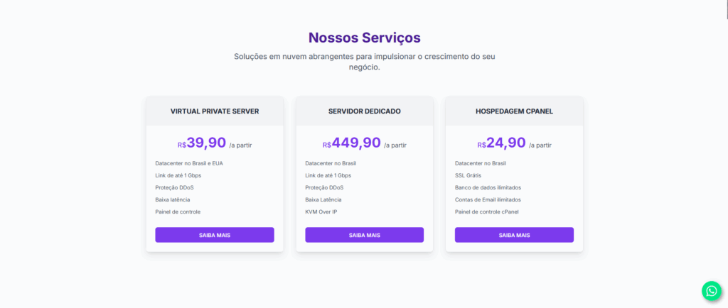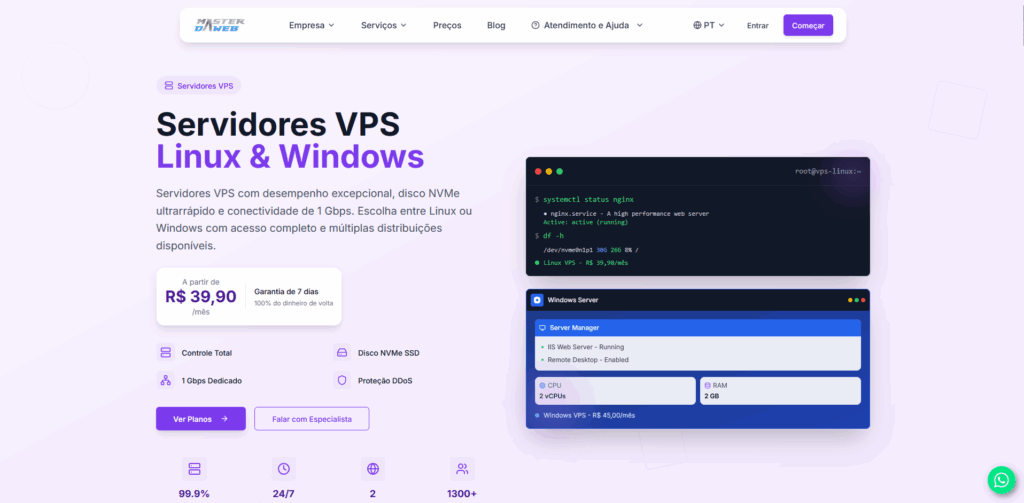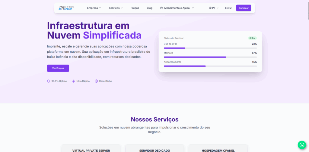 Passo 1: Acesse o site oficial da Master da Web em masterdaweb.com. Ao entrar na página inicial, role para baixo até encontrar o card “VPS (Virtual Private Server)”. Quando localizar, clique em “Saiba Mais” para ser direcionado à página específica de servidores VPS.