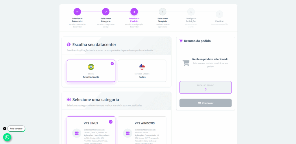 Passo 3: Na página de contratação, escolha o datacenter desejado. Em seguida, selecione a categoria “VPS Linux”.