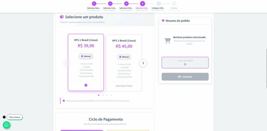 Passo 4: Agora, escolha o tipo de VPS que melhor atenda às suas necessidades. Depois, selecione o ciclo de pagamento (mensal, trimestral, semestral ou anual).