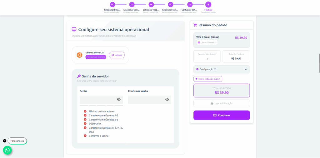 Passo 6: Crie uma senha de acesso para sua VPS. Logo depois, você poderá personalizar as especificações do servidor, ajustando recursos como vCPUs, memória RAM, armazenamento e outras configurações conforme sua necessidade.