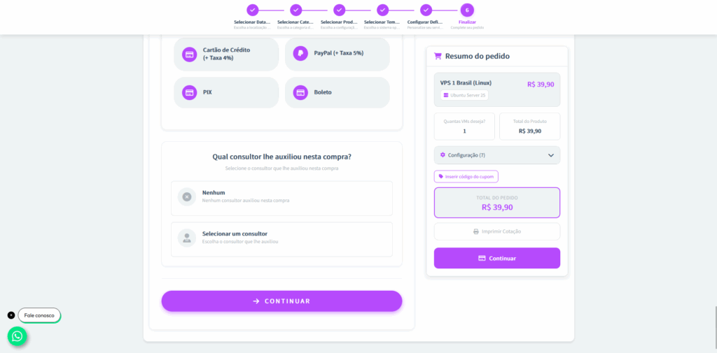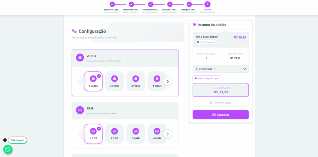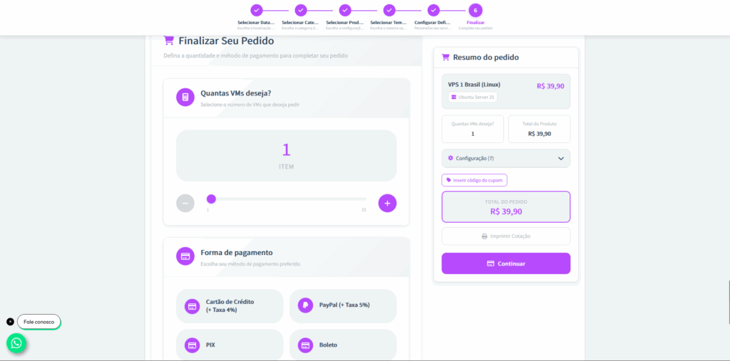 Passo 7: Após a personalização, escolha quantas VMs (Virtual Machines) deseja contratar e defina a forma de pagamento.