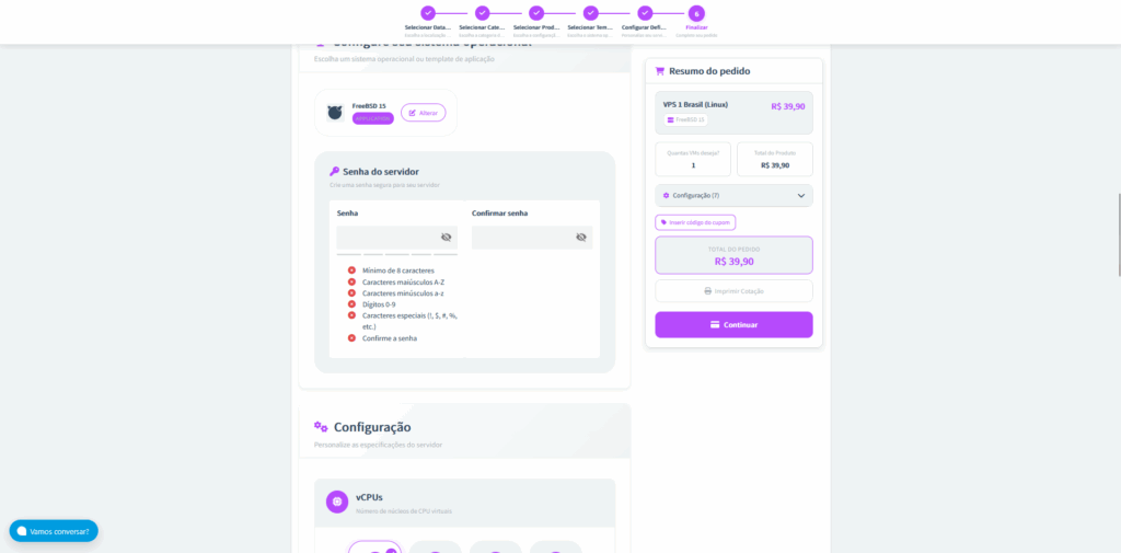 Passo 6: Crie uma senha de acesso para sua VPS. Logo depois, você poderá personalizar as especificações do servidor, ajustando recursos como vCPUs, memória RAM, armazenamento e outras configurações conforme sua necessidade.