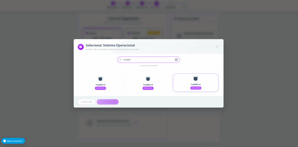 Passo 5: Em seguida, defina o Sistema Operacional da sua VPS. Nesse caso, escolha a versão do FREEBSD que mais te atenda e depois clique em Selecionar.