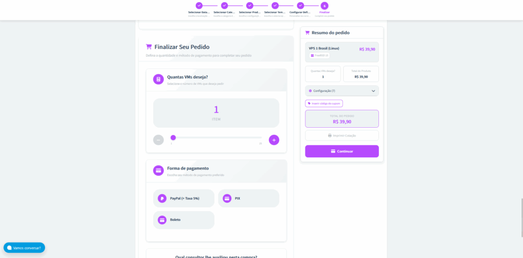 Passo 7: Após a personalização, escolha quantas VMs (Virtual Machines) deseja contratar e defina a forma de pagamento.